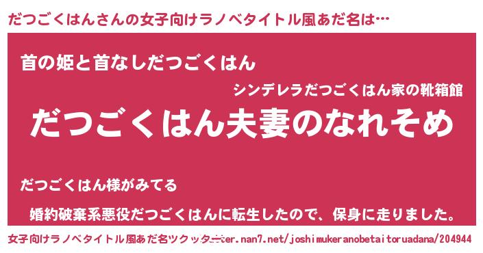 | 男性向けラノベタイトル風あだ名 | 『おまえをオタクにしてやるから、俺をだつごくはんにしてくれ! 』 |