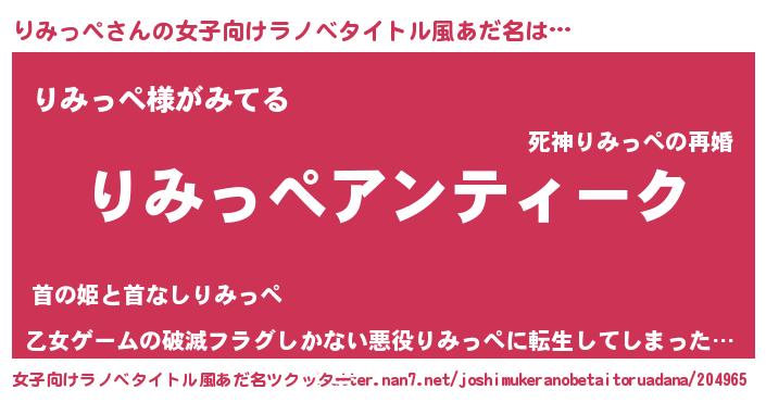 | 意味不明あだ名 | 『自称りみっぺ』『もやし科りみっぺ属』 |