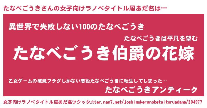 | 男性向けラノベタイトル風あだ名 | 『うちの娘の為ならば、俺はもしかしたらたなべごうきも倒せるかもしれない。』 |