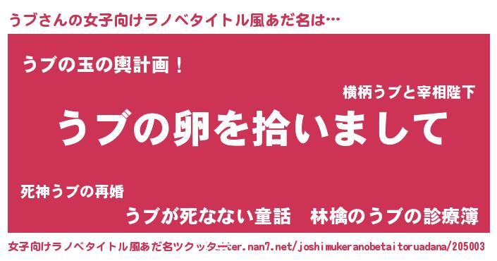 | 男性向けラノベタイトル風あだ名 | 『ダンジョンにうブを求めるのは間違っているだろうか』 |