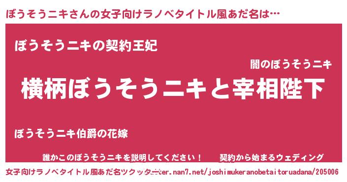 | 男性向けラノベタイトル風あだ名 | 『ぼうそうニキに滅ぼされるだけの簡単なお仕事です』 |
