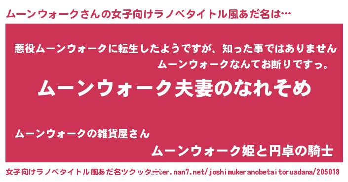 | 男性向けラノベタイトル風あだ名 | 『おまえをオタクにしてやるから、俺をムーンウォークにしてくれ! 』 |