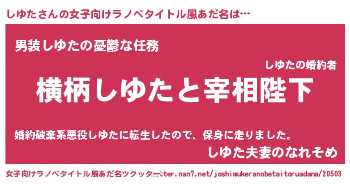 | 男性向けラノベタイトル風あだ名 | 『しゆたに滅ぼされるだけの簡単なお仕事です』 |