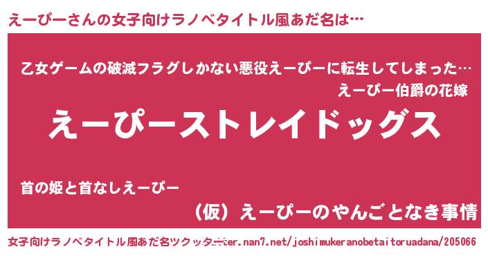 | 男性向けラノベタイトル風あだ名 | 『Re:えーぴーから始める異世界生活』 |