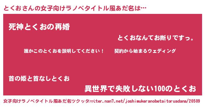 | 男性向けラノベタイトル風あだ名 | 『トクオアートオンライン』 |