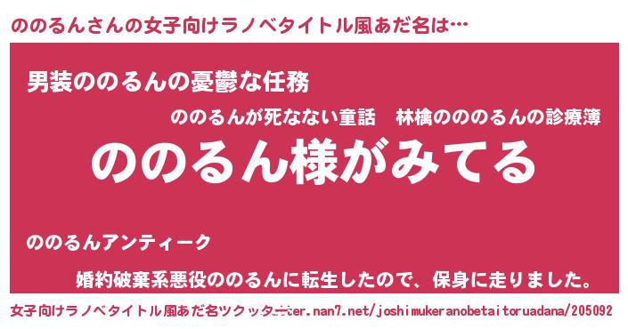 | 男性向けラノベタイトル風あだ名 | 『ののるんの嫁は女の子じゃないと思った?』 |