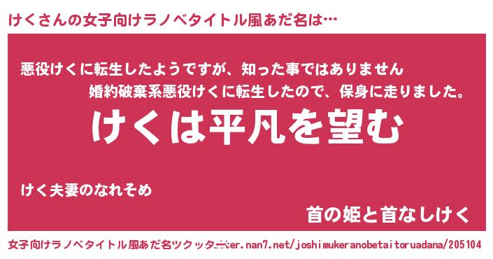 けくさんの女子向けラノベタイトル風あだ名は… 『けくは平凡を望む』『悪役けくに転生したようですが、知った事ではありません』『首の姫と首なしけく』 ツクッター #女子向けラノベタイトル風あだ名ツクッター http://tkutter.nan7.net/joshimukeranobetaitoruadana/205104/