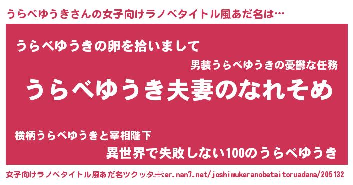 | 男性向けラノベタイトル風あだ名 | 『おまえをオタクにしてやるから、俺をうらべゆうきにしてくれ! 』 |