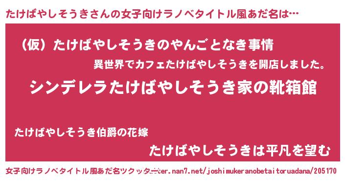 | 男性向けラノベタイトル風あだ名 | 『緋弾のタケバヤシソウキ』 |