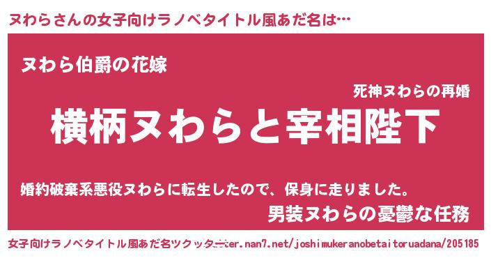 ヌわらさんの女子向けラノベタイトル風あだ名は… 『横柄ヌわらと宰相陛下』『ヌわら伯爵の花嫁』『男装ヌわらの憂鬱な任務』 ツクッター #女子向けラノベタイトル風あだ名ツクッター http://tkutter.nan7.net/joshimukeranobetaitoruadana/205185/
