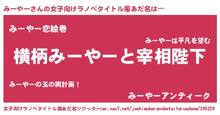 | 男性向けラノベタイトル風あだ名 | 『みーやーに滅ぼされるだけの簡単なお仕事です』 |