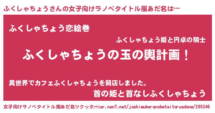 | 男性向けラノベタイトル風あだ名 | 『ふくしゃちょう~年齢イコール彼女いない歴の魔法使い~』 |