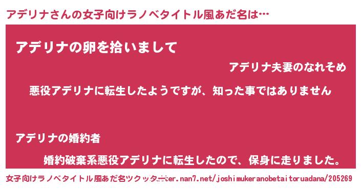| 男性向けラノベタイトル風あだ名 | 『この素晴らしい世界にアデリナを!』 |