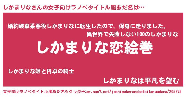 | 男性向けラノベタイトル風あだ名 | 『おまえをオタクにしてやるから、俺をしかまりなにしてくれ! 』 |