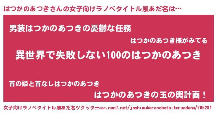 | 男性向けラノベタイトル風あだ名 | 『はつかのあつきという概念が存在しない退屈な世界 』 |