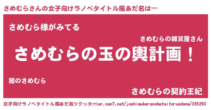 | 男性向けラノベタイトル風あだ名 | 『さめむら~年齢イコール彼女いない歴の魔法使い~』 |