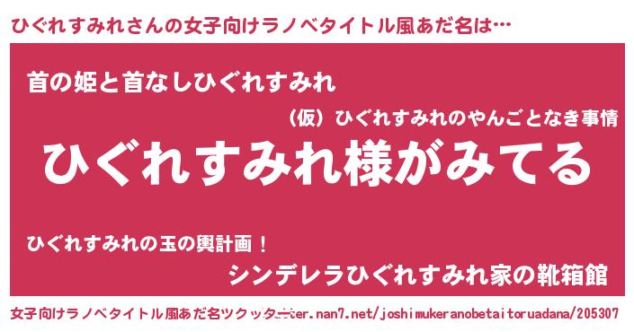 | 男性向けラノベタイトル風あだ名 | 『ひぐれすみれの嫁は女の子じゃないと思った?』 |