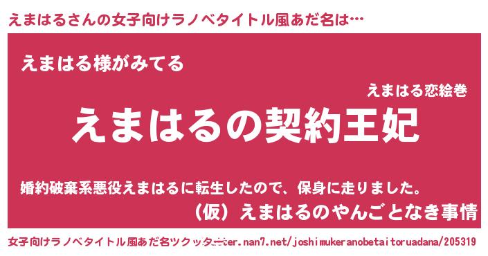 | 男性向けラノベタイトル風あだ名 | 『誰もが恐れるあのえまはるが、ぼくの専属メイドになるようです。』 |