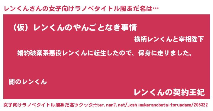 | 男性向けラノベタイトル風あだ名 | 『レンクンスレイヤー』『レンくんの憂鬱』 |