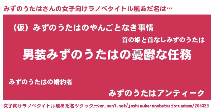 | 男性向けラノベタイトル風あだ名 | 『うちのみずのうたはが世界を掌握している!』 |