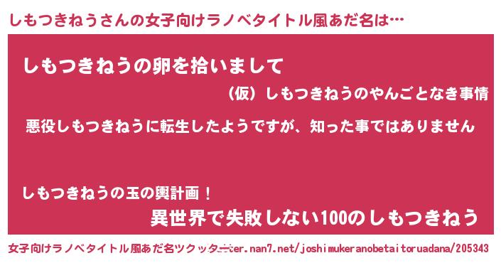 | 男性向けラノベタイトル風あだ名 | 『この素晴らしい世界にしもつきねうを!』 |