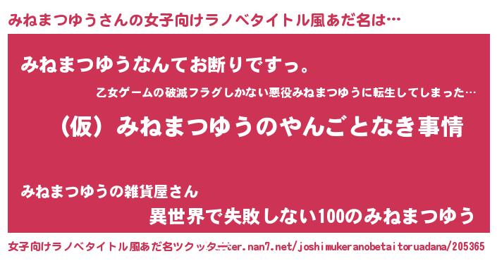 | 男性向けラノベタイトル風あだ名 | 『みねまつゆうの憂鬱』 |