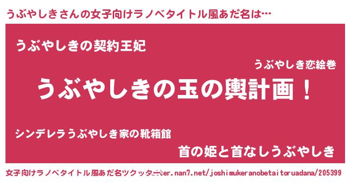 | 男性向けラノベタイトル風あだ名 | 『うぶやしき~年齢イコール彼女いない歴の魔法使い~』 |