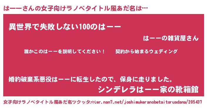 はーーさんの女子向けラノベタイトル風あだ名は… 『誰かこのはーーを説明してください! ~契約から始まるウェディング~』『異世界で失敗しない100のはーー』『シンデレラはーー家の靴箱館』 ツクッター #女子向けラノベタイトル風あだ名ツクッター http://tkutter.nan7.net/joshimukeranobetaitoruadana/205437/