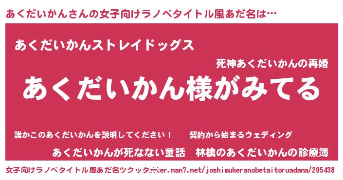 | 男性向けラノベタイトル風あだ名 | 『あくだいかんの嫁は女の子じゃないと思った?』 |