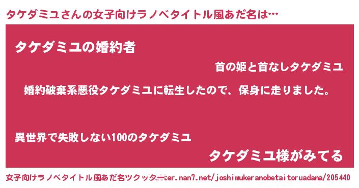 | 男性向けラノベタイトル風あだ名 | 『タケダミユスレイヤー』 |
