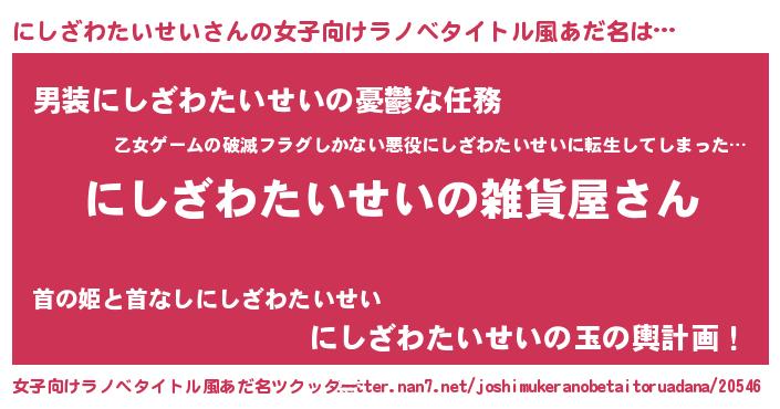 | 男性向けラノベタイトル風あだ名 | 『やはりにしざわたいせいの青春ラブコメはまちがっている 』 |