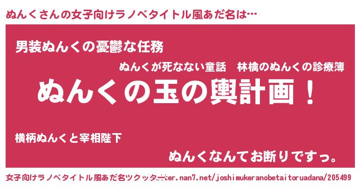 | 男性向けラノベタイトル風あだ名 | 『転生したらぬんくだった件』 |