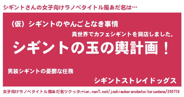 | 男性向けラノベタイトル風あだ名 | 『シギント~年齢イコール彼女いない歴の魔法使い~』 |