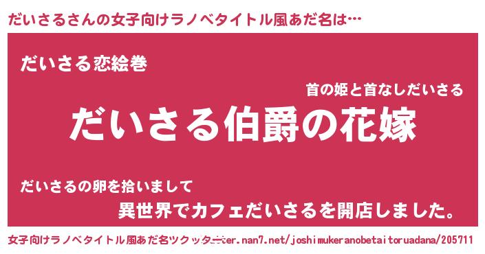 | 男性向けラノベタイトル風あだ名 | 『うちの娘の為ならば、俺はもしかしたらだいさるも倒せるかもしれない。』 |