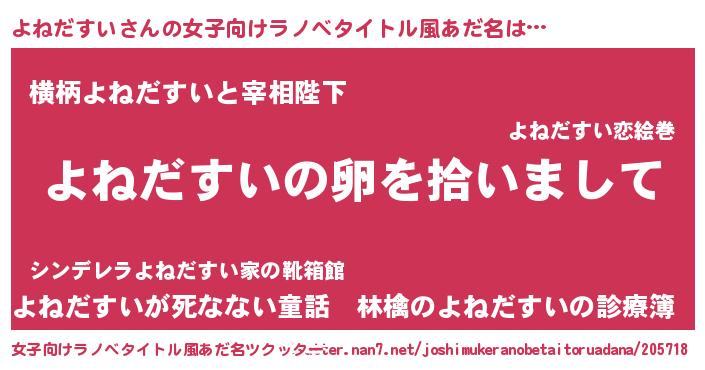 | 男性向けラノベタイトル風あだ名 | 『よねだすいの嫁は女の子じゃないと思った?』 |