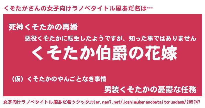 | 男性向けラノベタイトル風あだ名 | 『うちの娘の為ならば、俺はもしかしたらくそたかも倒せるかもしれない。』 |