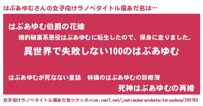 | 男性向けラノベタイトル風あだ名 | 『はぶあゆむという概念が存在しない退屈な世界 』 |