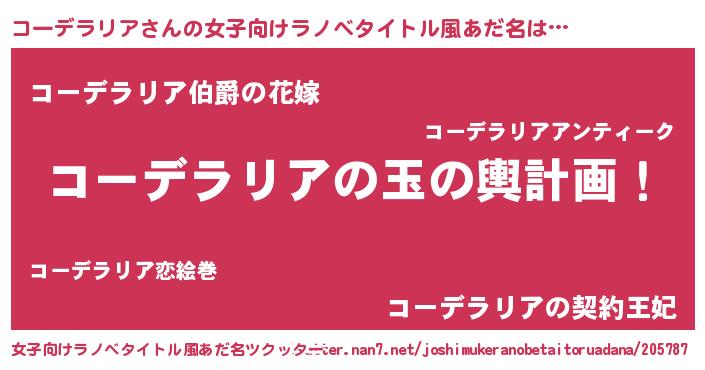 | 男性向けラノベタイトル風あだ名 | 『コーデラリア~年齢イコール彼女いない歴の魔法使い~』 |