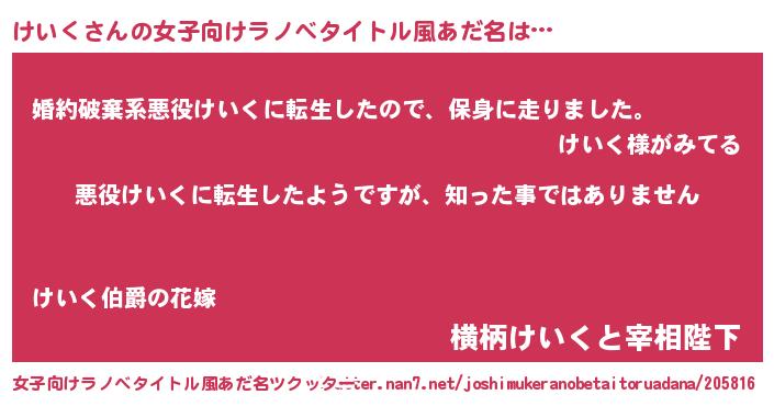 | 胡散臭い通販商品みたいなあだ名 | 『あなたにだけ特別に提供する限定10本のレアな日本酒…その名も「けいく」』 |