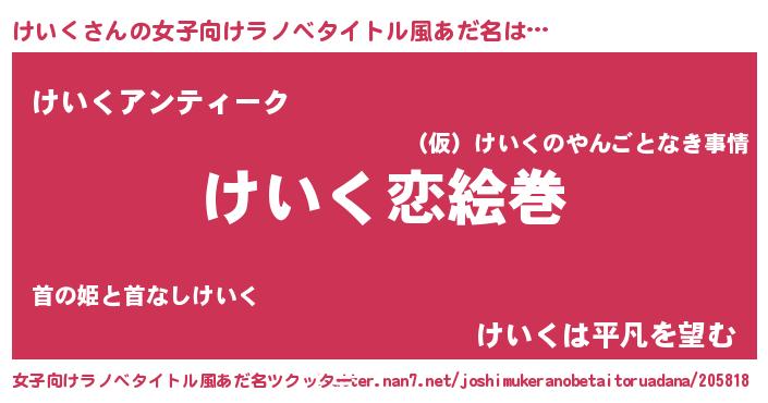 | 男性向けラノベタイトル風あだ名 | 『おまえをオタクにしてやるから、俺をけいくにしてくれ! 』 |