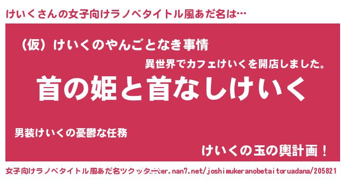 けいくさんの女子向けラノベタイトル風あだ名は… 『首の姫と首なしけいく』『(仮)けいくのやんごとなき事情』『けいくの玉の輿計画!』 ツクッター #女子向けラノベタイトル風あだ名ツクッター http://tkutter.nan7.net/joshimukeranobetaitoruadana/205821/