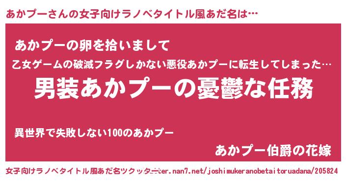 | 男性向けラノベタイトル風あだ名 | 『冴えないあかプーの育てかた』 |