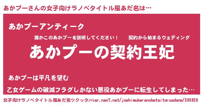 | 男性向けラノベタイトル風あだ名 | 『あかプーという概念が存在しない退屈な世界 』 |