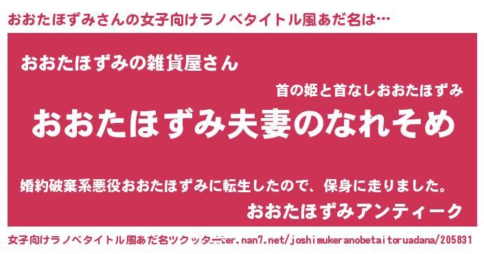 おおたほずみさんの女子向けラノベタイトル風あだ名は… 『おおたほずみ夫妻のなれそめ』『おおたほずみの雑貨屋さん』『おおたほずみアンティーク』 ツクッター #女子向けラノベタイトル風あだ名ツクッター http://tkutter.nan7.net/joshimukeranobetaitoruadana/205831/