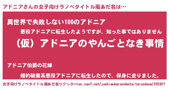 | 男性向けラノベタイトル風あだ名 | 『アドニアの憂鬱』『アドニアスレイヤー』 |