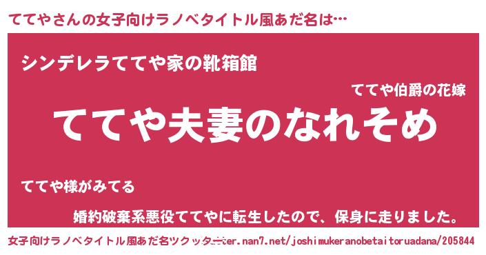 | 男性向けラノベタイトル風あだ名 | 『おまえをオタクにしてやるから、俺をててやにしてくれ! 』 |