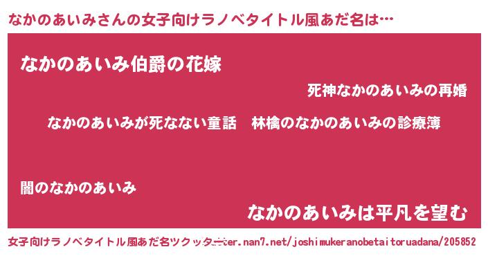 なかのあいみさんの女子向けラノベタイトル風あだ名は… 『なかのあいみが死なない童話 林檎のなかのあいみの診療簿』『なかのあいみ伯爵の花嫁』『なかのあいみは平凡を望む』 ツクッター #女子向けラノベタイトル風あだ名ツクッター http://tkutter.nan7.net/joshimukeranobetaitoruadana/205852/