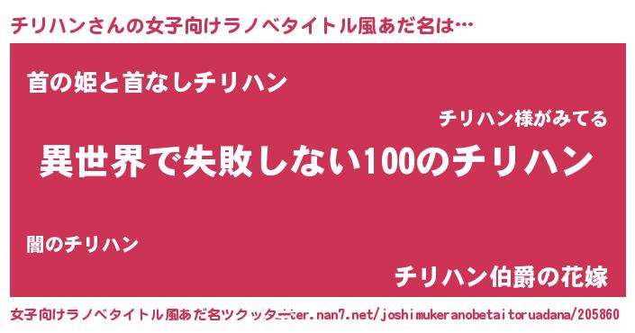 チリハンさんの女子向けラノベタイトル風あだ名は… 『異世界で失敗しない100のチリハン』『首の姫と首なしチリハン』『チリハン伯爵の花嫁』 ツクッター #女子向けラノベタイトル風あだ名ツクッター http://tkutter.nan7.net/joshimukeranobetaitoruadana/205860/