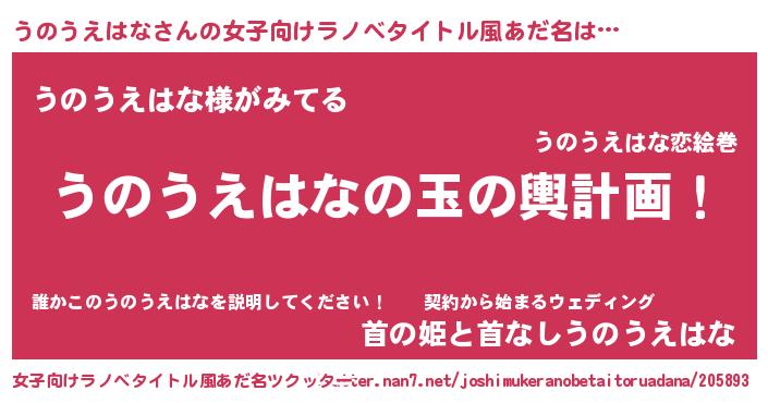 うのうえはなさんの女子向けラノベタイトル風あだ名は… 『うのうえはなの玉の輿計画!』『うのうえはな様がみてる』『首の姫と首なしうのうえはな』 ツクッター #女子向けラノベタイトル風あだ名ツクッター http://tkutter.nan7.net/joshimukeranobetaitoruadana/205893/