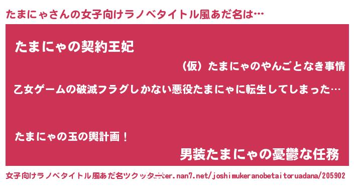 | 男性向けラノベタイトル風あだ名 | 『この素晴らしい世界にたまにゃを!』 |